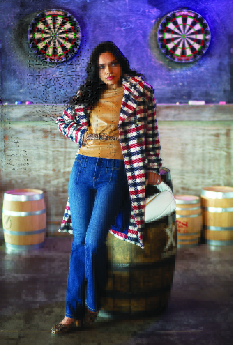 A bold plaid and pearl-studded collar — it’s removable — makes this lightweight coat from Pearl by Lela Rose ($465) a definite statement piece. We’ve paired it with Free People flared jeans ($98) and the AS by DF New Guard recycled leather short-sleeve T ($276, Neiman Marcus Fort Worth). Of course, we love a good animal print, so accessories include Ann Mashburn’s Savanna Leopard Pony buckle shoe ($350, You Are Here) and a calf hair leopard-print belt ($65, J. Crew). Off White’s Pump Pouch top-handle leather bag ($1,685, Neiman Marcus Fort Worth) proves white isn’t just a seasonal color.