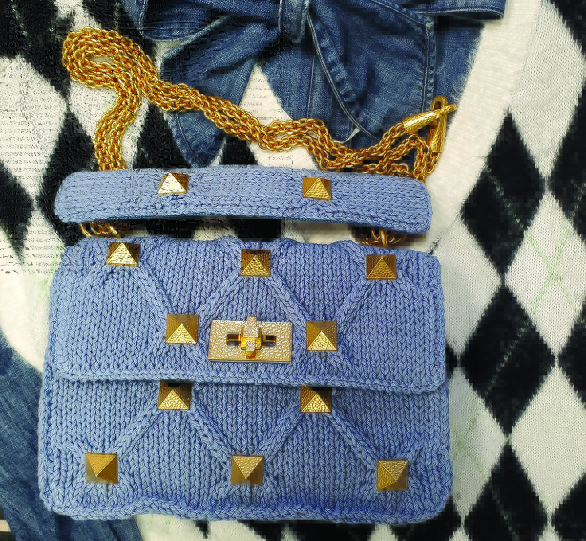 Stuck in neutral? Go bold with prints and colors. We paired Kerri Rosenthal’s Patchwork Love cashmere sweater ($348, You Are Here) — opting for a full tuck — with Free People’s Shape Up trousers ($98) in a high-rise style and straight-leg silhouette. The look is pulled together with a Gucci silk neck scarf ($200, Chieffalo Americana); Tortuga leather belt ($68, Free People); and Gucci white leather ankle boot with quilted detail ($980, Neiman Marcus Fort Worth). Add a little sparkle with this By Far Baby Cush Disco Green Hologram leather shoulder bag ($474, Neiman Marcus Fort Worth).