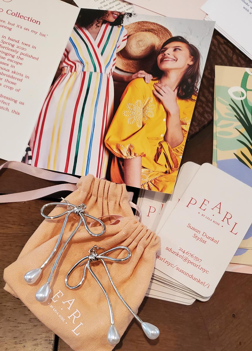 Pearl by Lela Rose Book an appointment with the stylists, who also can meet you at the Highland Park store. (Garment prices are the same.) Stephanie House 817-946-2958, [email protected], pearl.nyc/stephaniehouse Susan Dunkel 214-676-5517, [email protected], pearl.nyc/susandunkel. pearl.nyc