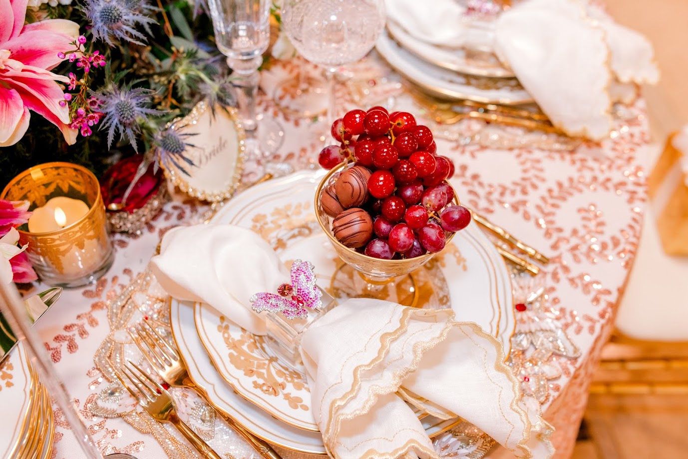 This shoot draws its inspiration from the stunning white and gold Ginori Aurum pattern, a favorite for its beauty and versatility. The bridal team at PS The Letter beautifully paired this elegant pattern with Arte Italica compotes in Vetro Gold Baroque and luxurious table linens, complemented by Baccarat crystal. The Diamant Butterflies placemats added a perfect nod to a lovely spring night, enhancing the enchanting atmosphere.