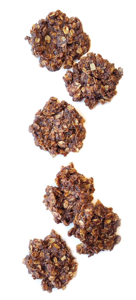 Line two baking sheets with parchment paper; drop heaping tablespoons onto the sheets and flatten slightly (you can use cupcake liners for more uniform shapes and easier cleanup). Allow to rest until cookies set and harden; refrigerate if necessary. Sugar-free version Use ¼ cup of honey