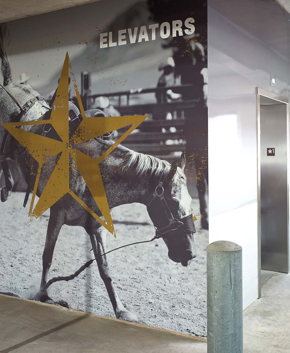 Inside, the elevators feature different rodeo scenes.