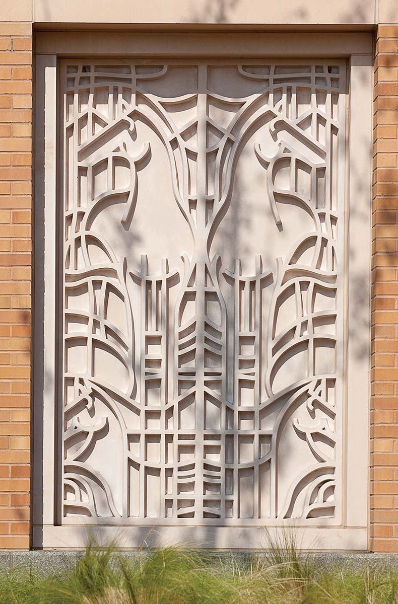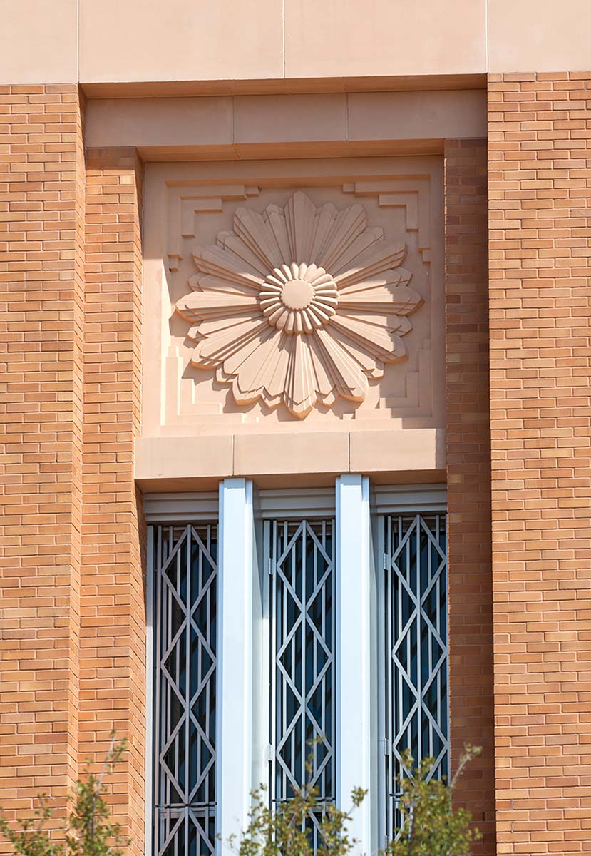 Much of the beauty of the building can be found in the details. Inset into the bricks are bas-relief panels. The building’s towers pay homage to nearby Pioneer Tower at Will Rogers Memorial Center.
