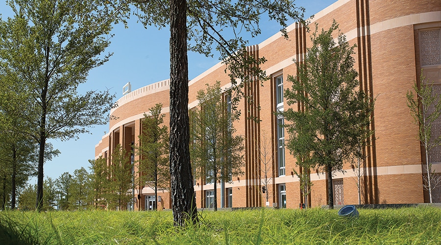 Three kinds of native grasses figure into the landscaping, filling ground beds and raised granite beds. Built-in benches invite guests to linger outside the arena. Approaches to the 560,000-square-foot arena and its 4.8-acre plaza include a walkway from the Chevrolet parking garage; an Italy-inspired curved staircase on the southeast corner, next to a deluxe elevator; and wide steps on the north side leading to the formal entrance. There, the entry is framed by two grand structures that emulate the iconic Will Rogers Coliseum tower just a stone’s throw to the north. There are numerous examples, outside and in, of thoughtful architectural details that tie the Dickies Arena design to that of the nearby art deco structure.