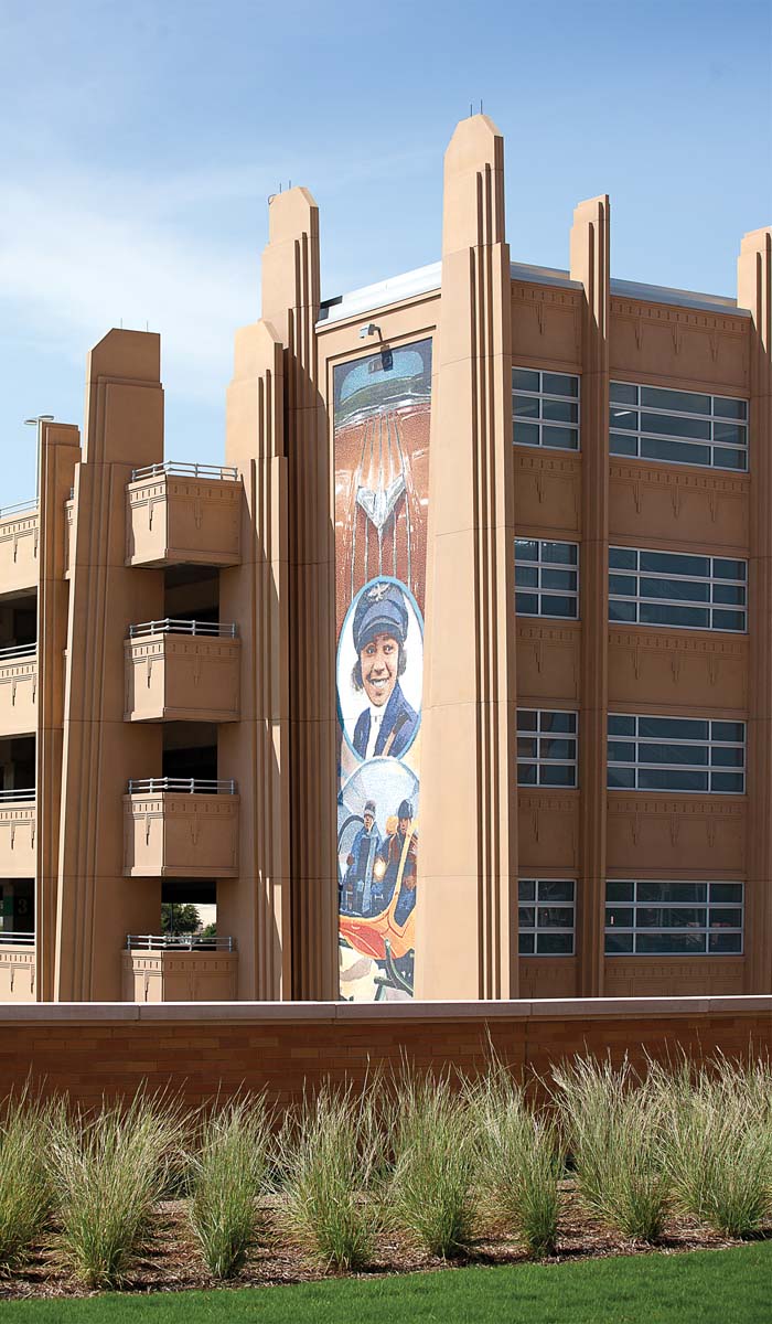 The six-story parking garage warrants its own noteworthy murals. Two 50-foot-tall tile mosaics created by Massachusetts artist Mike Mandel adorn the northeast and northwest corner towers of the garage. Facing east, the work called Pioneers of Texas Transportation honors the GM plant in Arlington, established in 1954; American civil aviator Bessie Coleman of Waxahachie, the first African-American pilot awarded an international pilot’s license; and Bell Aircraft Corporation’s 1951 opening in Fort Worth. Facing west, the mural called Stock Show Parades is an ode to philanthropist, oilman and cattle executive Sid Richardson, great-uncle to Dickies Arena champion and stock show chairman Ed Bass.