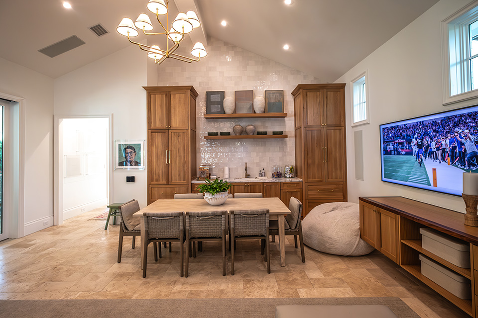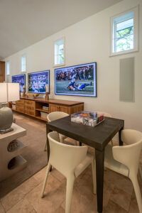 The newly constructed building is on an adjacent property the Dykeses bought when purchasing their home, less than a mile from TCU. It sits back from the street on what looks to be on the same lot as the residence, and it blends discreetly with the neighborhood, known for its large, leafy, mature lots and mix of elegant homes. The Dykeses modeled the recruiting house after their main residence to make it appear as if both had been built at the same time.