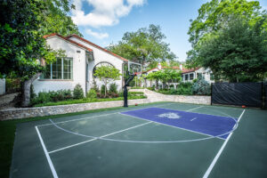 The recruiting house features two bathrooms, main entry room, guest bedroom, sitting room, storage on the backside and a patio facing the main house’s backyard and pool. Artificial turf borders the patio and includes a small putting green, fire pit, and steps down to a basketball and pickleball court.