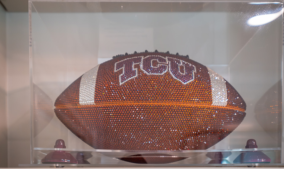 Several footballs sit on shelves inside the sitting room, including one covered in sparkles that says “TCU” and one with a quote from Spike Dykes, Sonny’s father. Spike was the head coach at Texas Tech from 1986-1999.