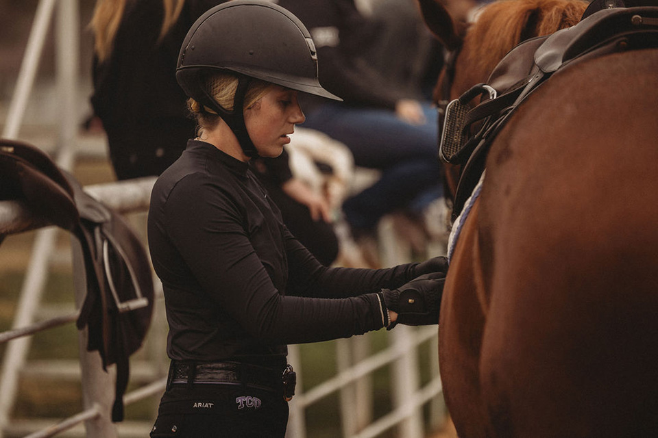 All that preparation is put to the test on meet days. When TCU hosts, student-athletes arrive around 6 a.m. to eat breakfast and groom the horses. The host school supplies 20 horses—five for each event—and riders are randomly assigned a horse before the meet.