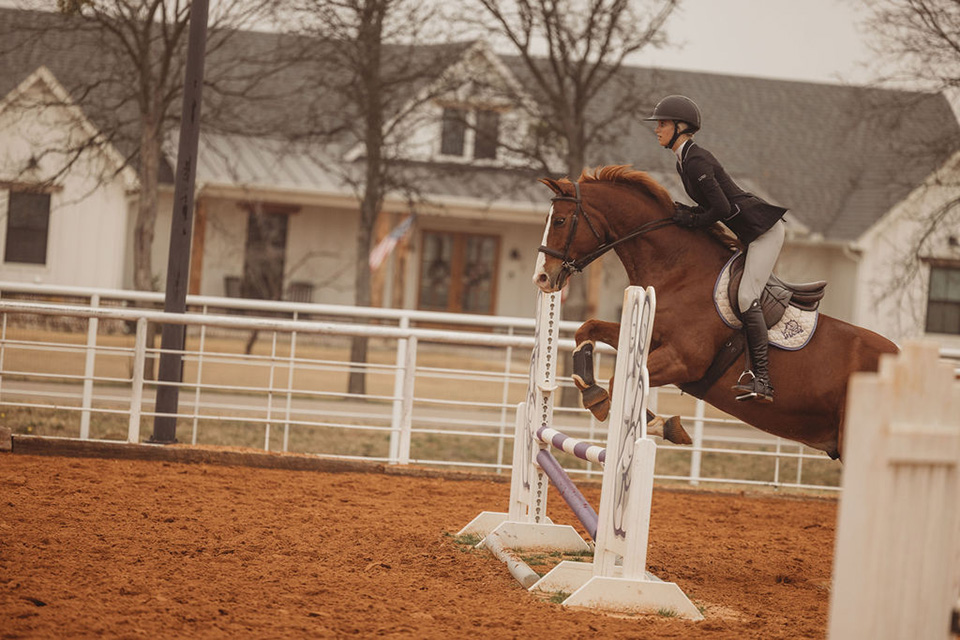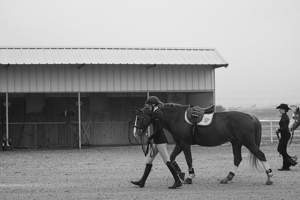 On a partly cloudy February morning at Bear Creek Farms, Texas Christian University (TCU) equestrian riders guide horses in and out of a riding arena.