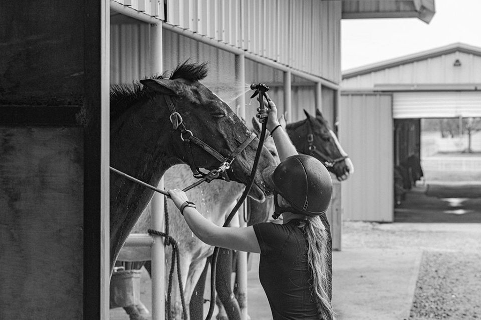 In addition to post-practice wash downs, riders take horses for walks, clean their hooves and even provide pre- or post-workout therapy. Horses might be placed on a TheraPlate, which uses vibrations to relax stiff muscles, or they’re wrapped in a Bemer blanket to stimulate circulation.