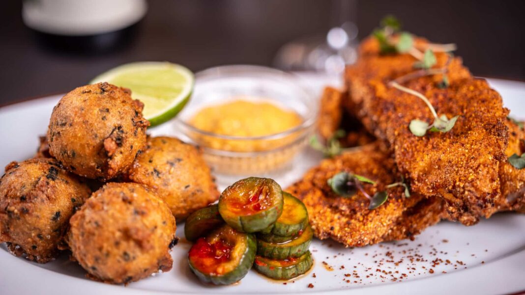 In other words, this isn’t your grandpa’s steak-‘n-taters joint. The New York strip is dry-aged wagyu with mignonette pepper, red watercress and a lush handmade Worcestershire sauce. Look closely, and you see that loaded potato gratin is a painstakingly constructed pavé creation. And yes, there’s a fish fry plate on the menu, but don’t overlook it. That’s delicately battered halibut, drizzled in spicy pickle juice with kimchi tartar sauce, nori hushpuppies and green tomatoes. Just want a snack in the bar? Try mini-wagyu dogs with bacon and hot and sweet peppers inside brioche rolls.