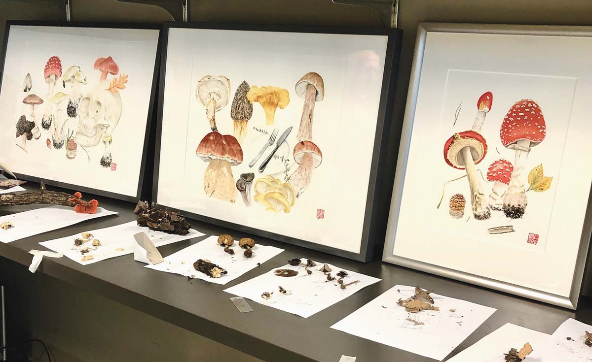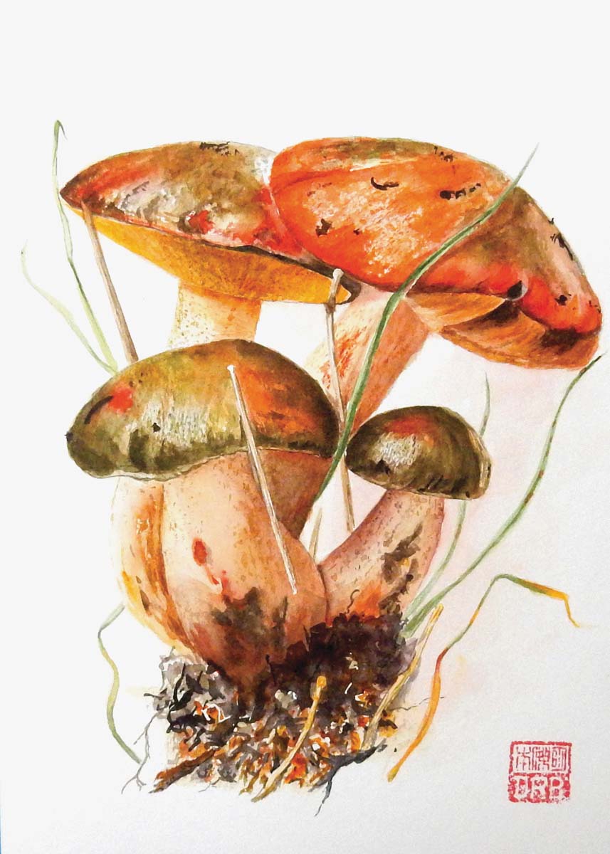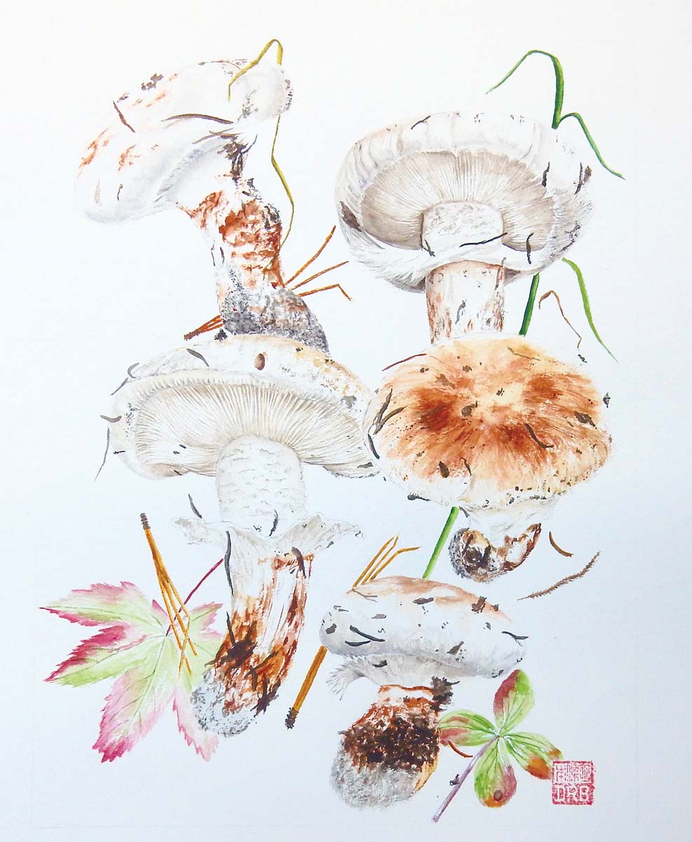 And what of the painting that has become more than an avocation? Benjamin had long enjoyed Washington’s mushroom festivals and was frequently tapped as a speaker. Before his move back to Texas he had joined his wife in taking a watercolor class during some downtime at one such event. The focus was mushrooms. The then 69-year-old had never before picked up a paintbrush. He found himself intrigued by the techniques as well as the instructor, renowned Russian botanical artist Alexander “Sasha” Viazmensky. “I found it amazing. I asked Sasha how on earth you paint a white mushroom on white paper. He said, ‘No problem.’ I watched a matsutake appear with a few strokes. It was magic.”