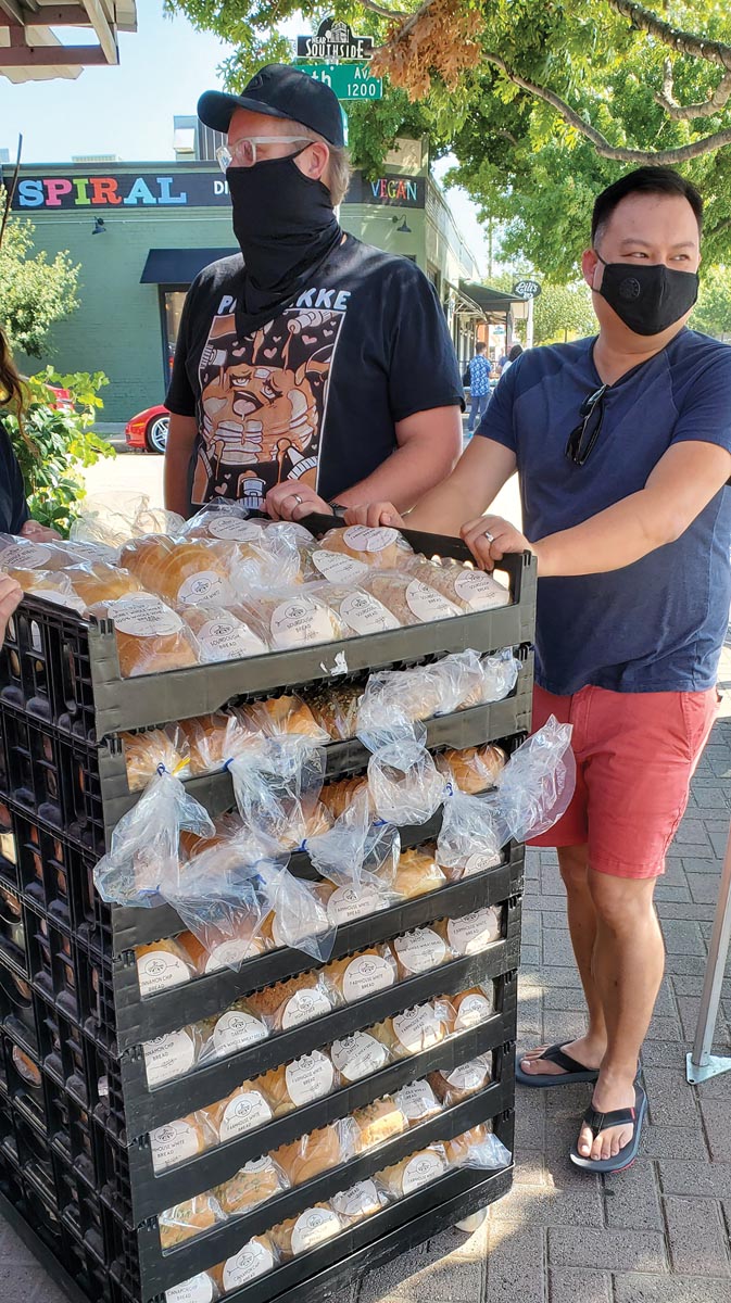 While the Family Meal Initiative rotated locations originally — and has missed only two Sundays due to Monday holidays — they now can be found regularly at Nonna Tata on Fort Worth’s Magnolia Avenue. It’s a corner spot, providing easy access, plus there’s a covered patio that gives volunteers protection from the elements and tables for filling bags. Neighboring Great Harvest Bread Co. contributes loaves of bread.