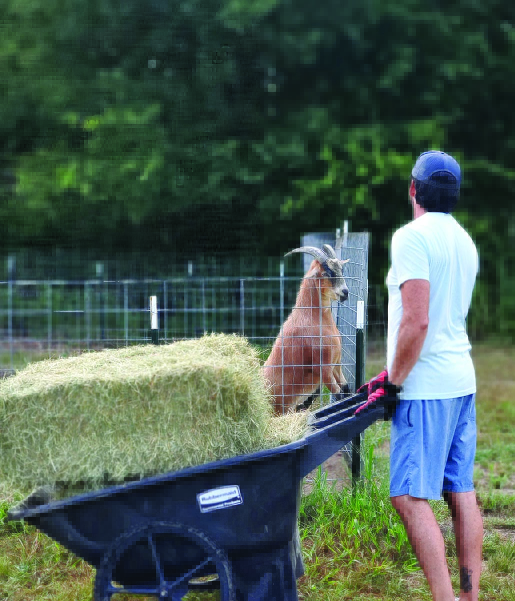 With clippers in hand, she snips bunches of arugula, and the peppery aroma fills the air. Bodhi, the farm dog, follows along and is rewarded with a small cucumber, one of his favorite snacks. In a fenced-in pen, a pair of Nigerian goats — they provide lots of fertilizer — watch us intently.