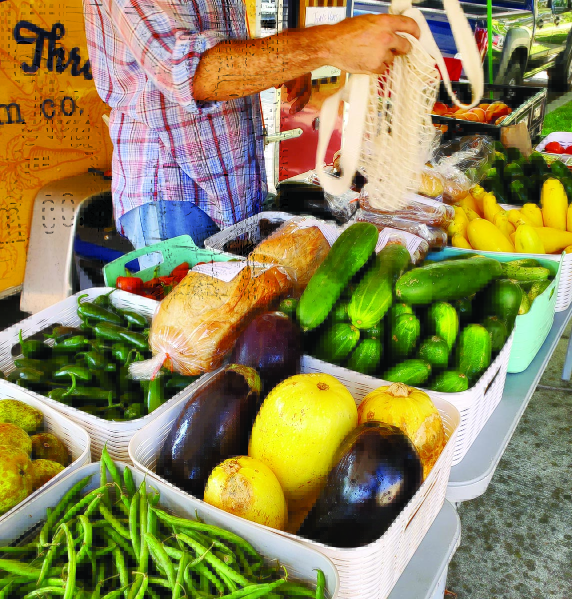 One of the biggest game changers was the addition of their mobile farm stand. You can’t miss the bright yellow trailer with sharp graphics, and it’s spacious enough to haul not only baskets of seasonal organic produce but also baked goods, local honey, canned jams and jellies, and coolers filled with grass-fed beef, heritage pork and pasture-raised chicken they sell for local ranchers and other growers. They also offer eggs from local farmers, and the couple recently got some baby ducks.