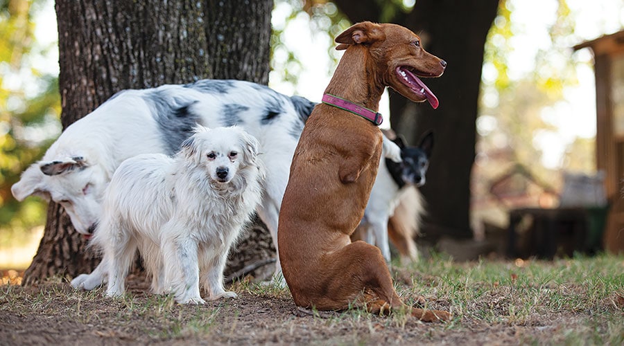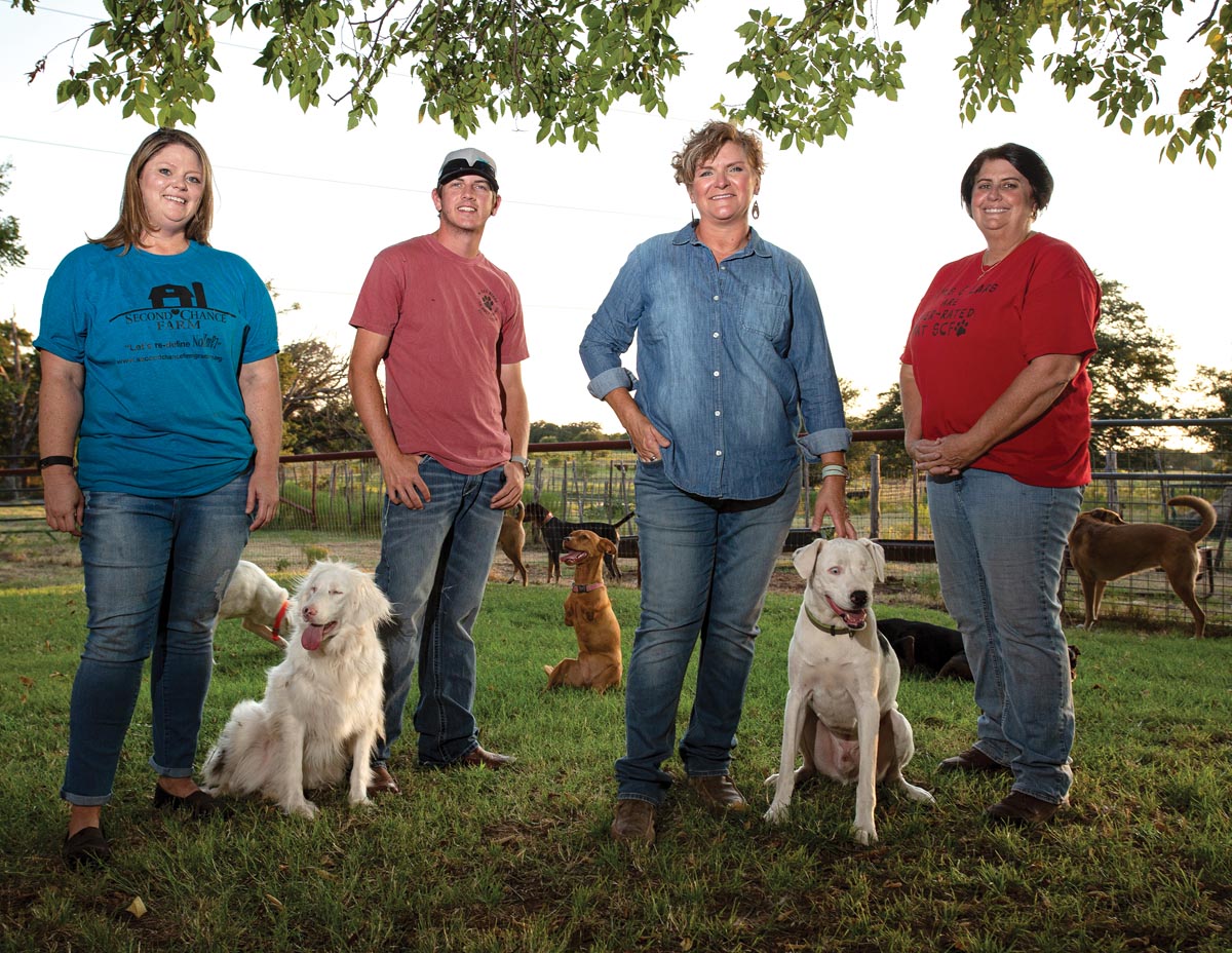 It’s a “family” portrait as Sandi Walker (in the denim shirt), founder of Second Chance Farm, always insists on being photographed with her staff. From left are Jennifer Rowley, who also has adopted a dog from SCF; full-time employee Logan Boggs; and longtime volunteer Chris Follis. Some of the dogs knew when to sit up and be still for the photo, too. From left are Izzy, Grace (the little brown two-legged dog) and Doofus, the farm’s mascot.