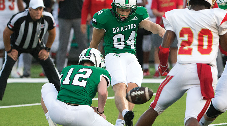 “That’s unique at the high school level to have an elite kicker that we trust and have trusted for a long time,” coach Riley Dodge says of McFadden. “He’s a veteran and smart kid and understands what we’re trying to do. He’s a leader. I think one knock on kickers is that they’re just a kicker. He’s a leader on our football team, one of the hardest workers in the offseason and vocal as well. Guys really respect Joe. We’re thankful we have him.”