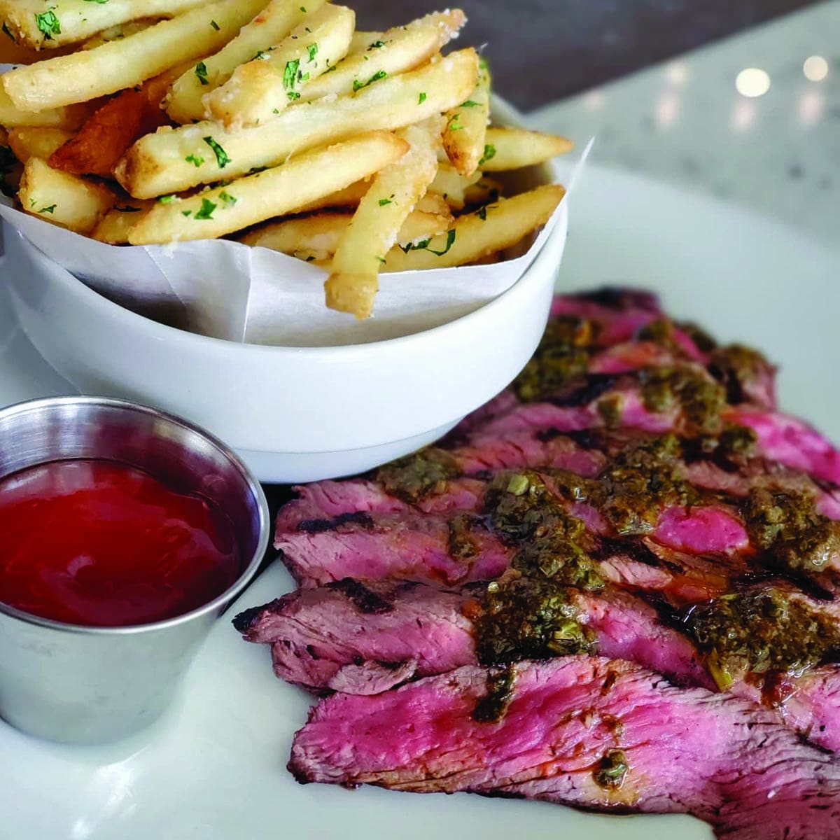 This casual eatery/bar is home to the 107’s first public pickleball courts. The former HQ of the Mopac Event Center has transitioned nicely into a restaurant thanks to the addition of more windows and slide-up glass doors allowing diners a better view of the action on the courts. And the menu is not your typical bar food. Complimentary crispy pickles start every meal. For snacking, we like the chunky pimento cheese with crispy sesame crackers and the hummus. Substantial entrees include steak frites with a just-right chimichurri sauce. If you’re spectating, you can dine courtside or hang out in the faux-turfed garden kept warm by plenty of heaters. Sign up for classes if you’re a pickleball novice; equipment rentals are available, too. Learn more on the website. 1615 Rogers Road, 682-255-5751, courtsidekitchenfw.com