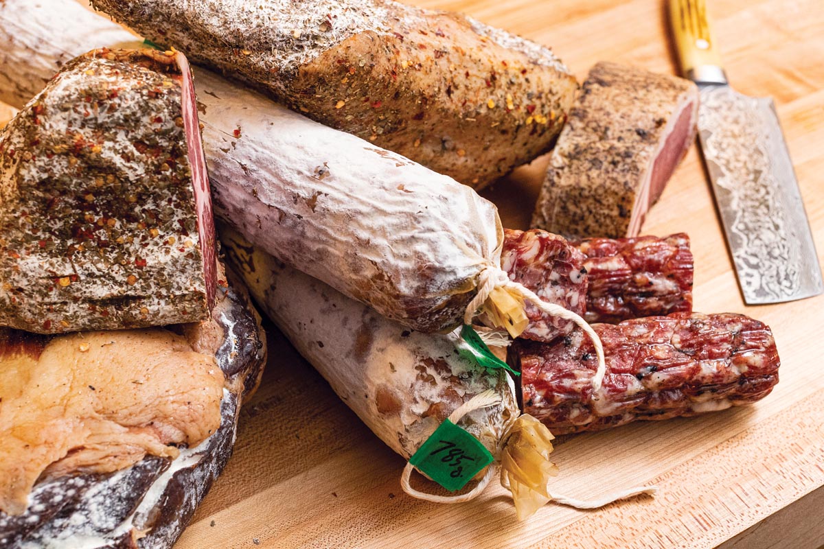 Steve Hoogeboom checks on the progress of the salumi, including tasting it. The green tags are marked with dates and original weight as the aging process affects the density. Photo by Jeremy Enlow