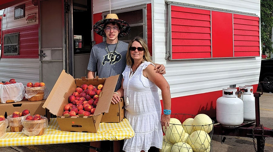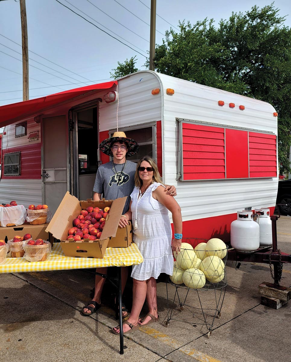 A small red-and-white camper trailer holds some of the supplies, and Shannon also drives a vintage red pickup, both suited to this roadside entrepreneur who, along with Finn, started selling peaches almost 10 years ago.