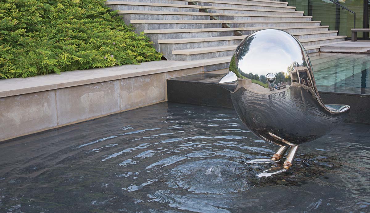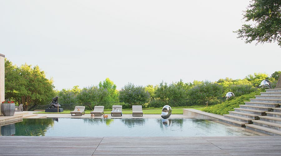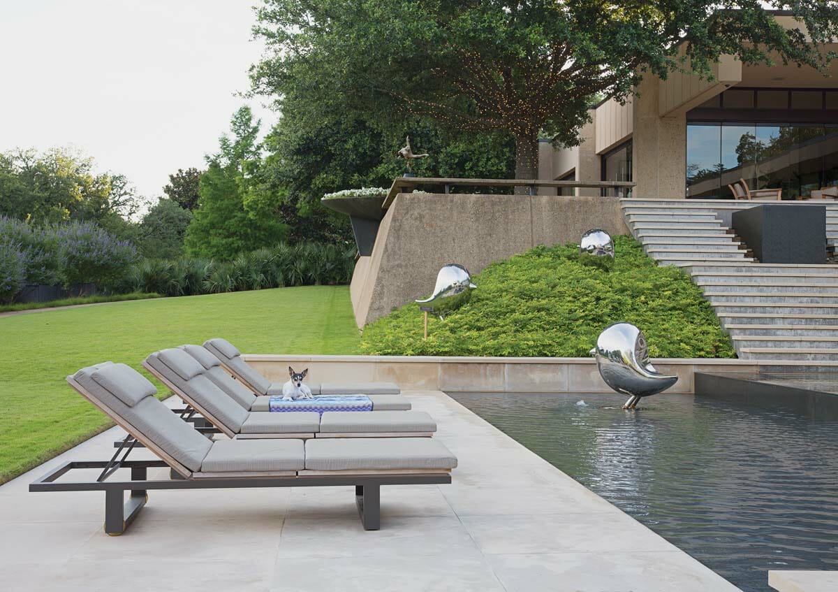 One of a trio of stainless steel birds from Texas artist Brad Oldham stands guard in the shallow water (the other two sit in the landscaped slope leading up to the patio terrace). The dogs pay these metal creatures no mind. They’re interested in finding the perfect chaise lounge or nosing through the landscaping.