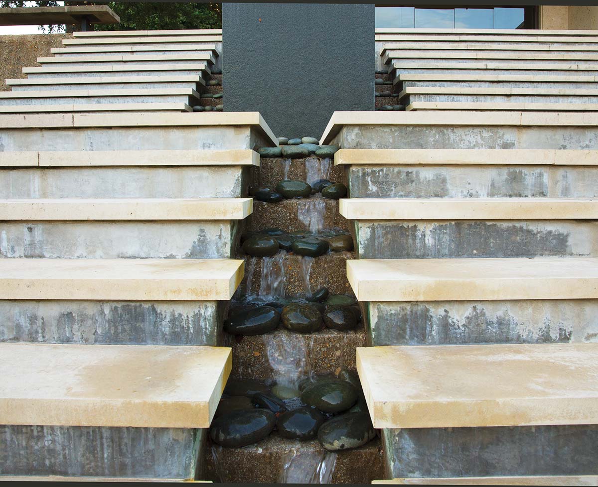 The expanse of the terrace steps is broken up by a black granite fountain and a river-rock-filled runnel.