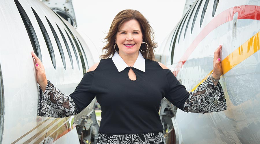 Passionate about aviation, Penney Pollard worked for an airline company for 18 years before she began running one of the five companies she owns with her husband, also a pilot. Before her current life took wing, there was a stint flipping houses. “I bought really bad houses,” she says, laughing. Resurrecting them stoked a creative fire in her that she now fans by designing furniture made from airplanes.