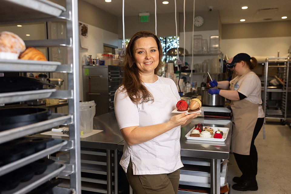 Anna Narinian cuts the rhombus-shaped croissant in half while excitedly explaining what makes her creation unique to a guest sitting across from her at a small cafe table.