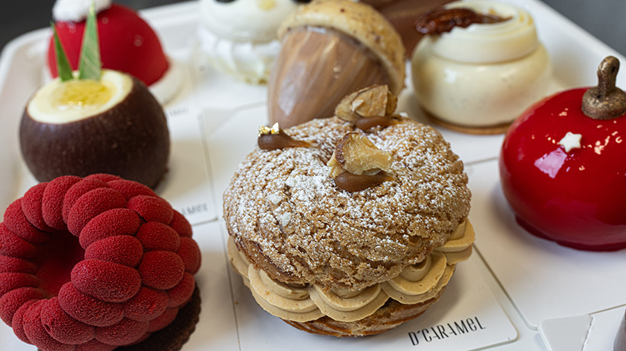 Each pastry resembles something one might see in daily life. The seasonal red Christmas ornament contains cranberries, oranges and spices, while the acorn has several layers, including hazelnut mousse. A coffee bean of Mascarpone mousse, coffee cremeux and almond and caramel crunch replicates Tiramisu, and the raspberry is ideal for chocolate mousse lovers.