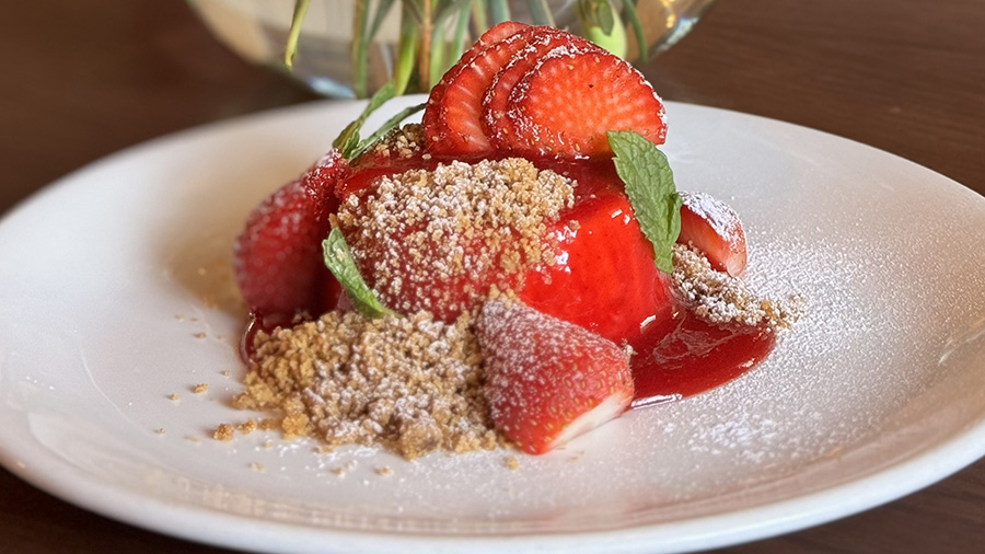 The first course offers a choice of classic Caesar salad, chef’s tomato soup or a strawberry and beet salad. The second course is a choice of eye of ribeye, chef’s roasted chicken breast or spaghetti scampi. For the dessert course, you can choose either the special strawberry cheesecake or pot de creme.