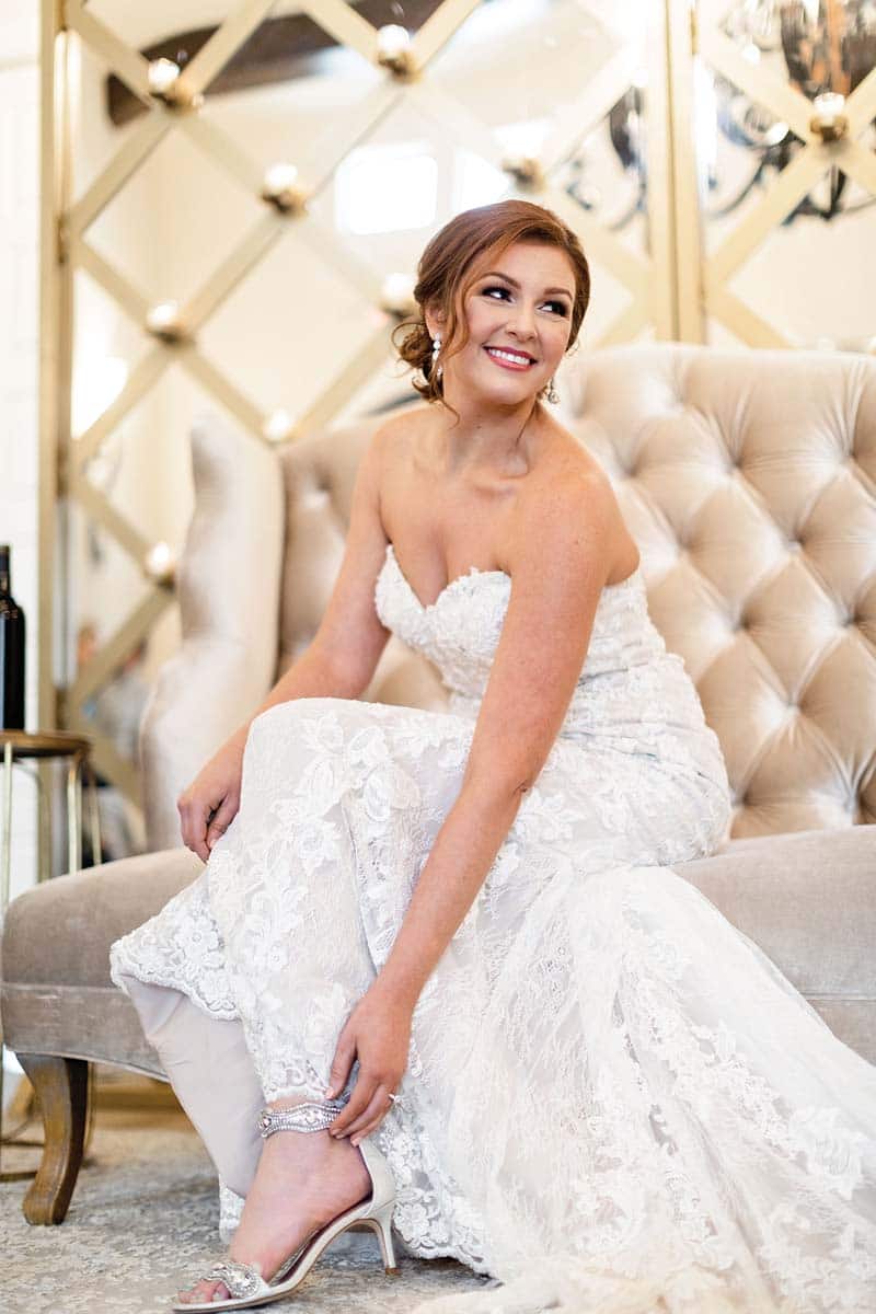 Two Girls in Pearls Events recently used the new venue as the backdrop and inspiration for a styled wedding shoot, stopping in each space to design vignettes showing how to play up the setting’s vineyard elegance. In the ballroom, romantic red and lustrous gold are featured in table settings and dramatic flower arrangements. In the barrel room, white hydrangeas spill off a harvest table set for celebration under low lights and flickering candles. And in the tasting room, a wood dining table with a free-flowing floral and fruit centerpiece is set with hemstitch linen napkins, white china and enough wineglasses to pair a different varietal with each course. The bride wears a romantic strapless gown from Bliss Bridal Salon, along with a loose, romantic updo; her groom is in a classic tuxedo.