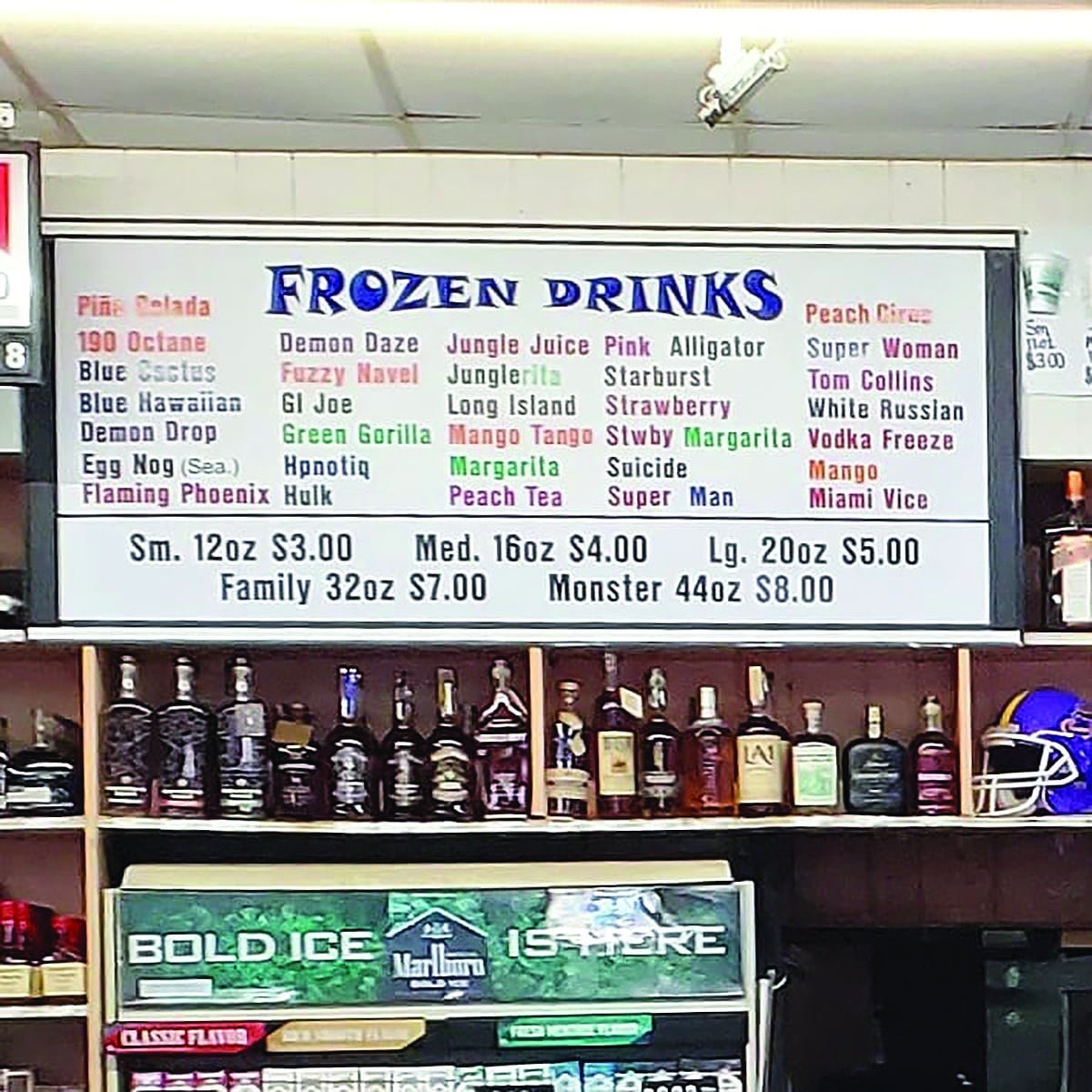 Frankly, we were expecting more of a dive. While Maggio’s doesn’t look like much from the outside, it’s spacious and well-stocked with beer, wine, liquor and a big menu of frozen drinks, which you can also order at the counter. For 8 bucks, you can get a 44-ounce cup of eggnog, which is seasonal, a Tom Collins or drinks such as the Demon Drop, Pink Alligator or Flaming Phoenix.