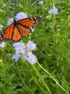 A: Things change all the time. Plants grow where they want to. The butterfly weed was originally planted toward the front near the street, but with the way the birds scattered the seeds, the butterfly weed is right in front of my window. I don’t get nearly as much work done as I should be doing because the monarchs are amazing to watch.