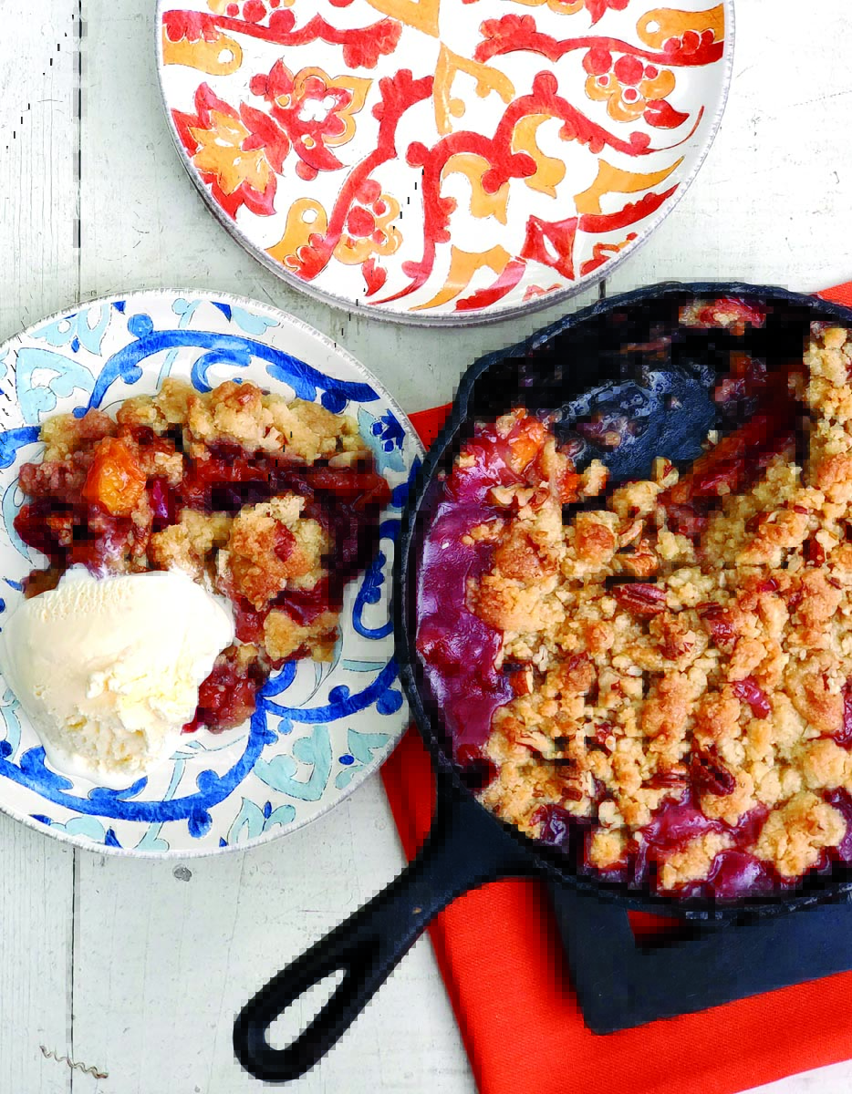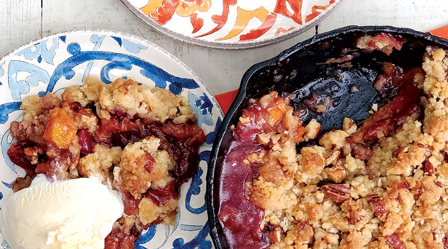 This summer, the native Texan gets a better chance to share his favorite dishes of the season as dining traffic returns (Provender reopened for lunch in late May). His passion for cast-iron cooking is evidenced by his fruit crisp, a dessert that showcases whatever is fresh from the market. While that means pears and apples in fall and berries in spring, in hot-weather months the crisp stars peaches or a combination of stone fruits — plums, cherries and nectarines. Served at the restaurant in individual cast-iron skillets, the dessert also gets a scoop of vanilla ice cream. “I’ve always loved warm fruit with cold ice cream melting on top and the contrast of crunchy crumble in between,” says Paslay. It gives you all the textures and flavors you want.”