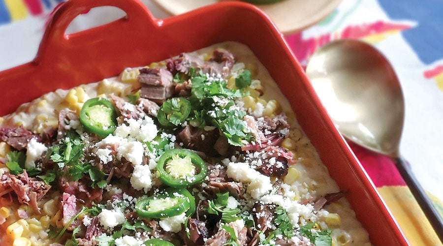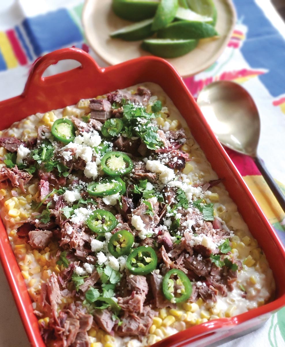 Sometimes the kernels are scraped into a paper cup or a cone with all the toppings — for easier eating. Though the street treat is called esquites (meaning corn off the cob) in Mexico, we Texans simply call them elotes — as do pitmasters Chris Magallanes and Ernest Morales at Panther City BBQ. On a whim, the duo elevated their version to an entree, and it’s a bestseller at their Fort Worth smokehouse. Augmenting the corn with loads of cheese and cream, they top it with generous chunks of their post oak-smoked brisket. At Panther City, it’s served by the pint, and they create big pans of it for special events. Easy to make at home, it’s a sure crowd-pleaser.